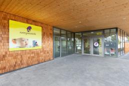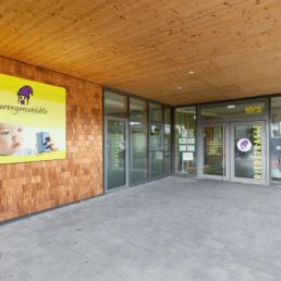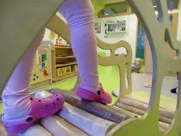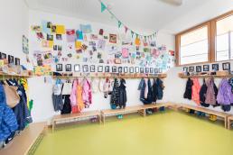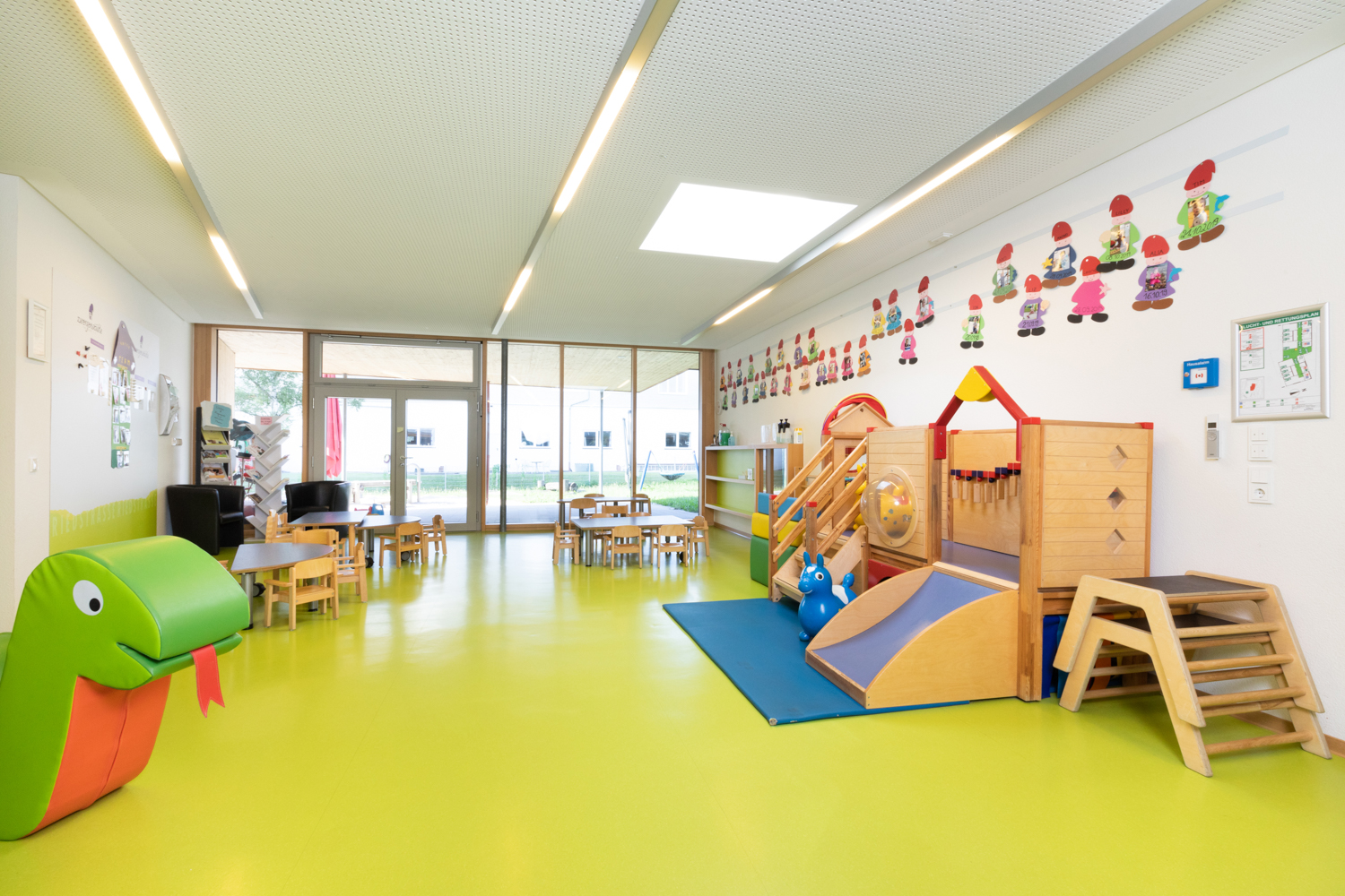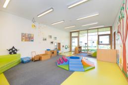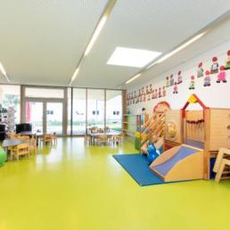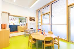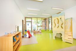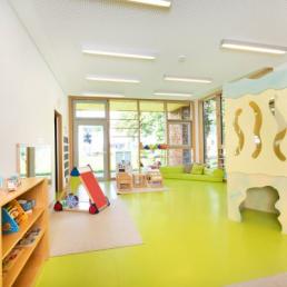In der großen Eingangshalle haben die Kinder viel Platz, um sich an der Bewegungsbaustelle auszutoben. Hier findet aber auch das Frühstück und das Mittagessen statt.