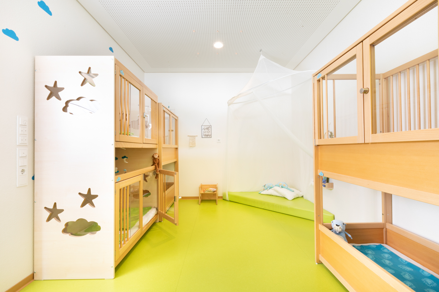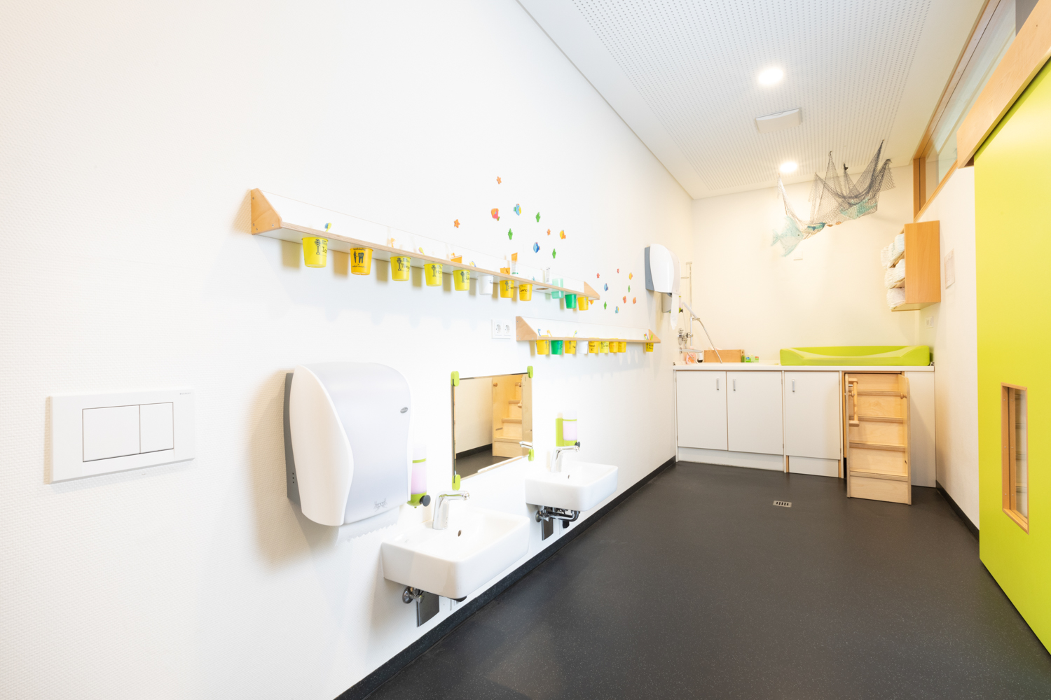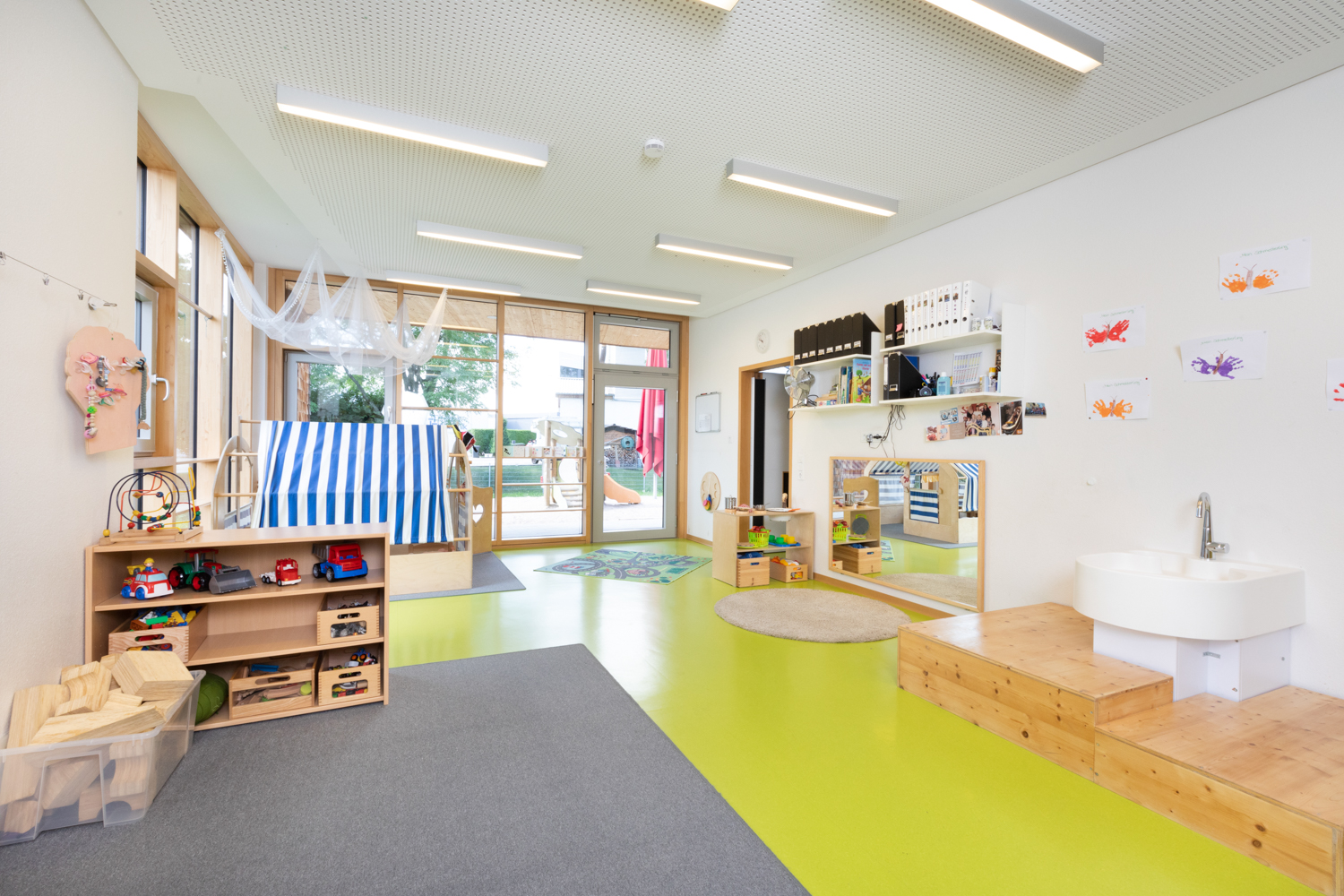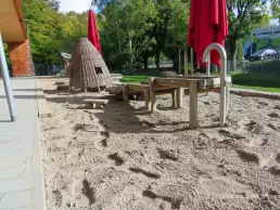 In jedem Gruppenraum gibt es ein anderes Spielelement wie den Wasserspieltisch, das Strandhäuschen, die Kletterbrücke oder die Spielburg, an dem die Kinder vieles ausprobieren und können.